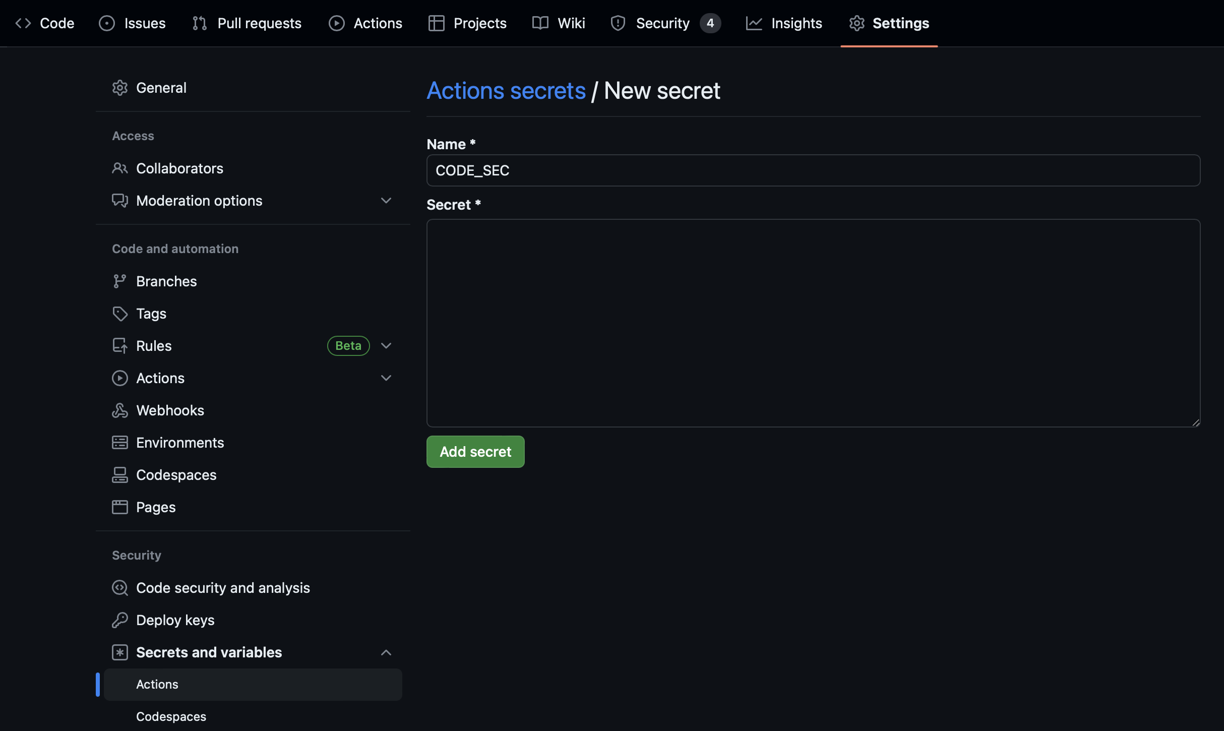 路徑如下:Settings > Secrets and variables > Actions > New repository secret